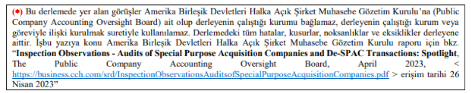 Amerika Birleşik Devletleri ‘Halka Açık Şirket Muhasebe Gözetim Kurulu’ (Public Company Accounting Oversight Board-PCAOB), yatırımcılara yönelik özel amaçlı satın alma şirketleri (special purpose acquisition companies; SPACs) kaynaklı riskler hakkında bir rapor yayınladı. Halka Açık Şirket Muhasebe Gözetim Kurulu’nun bu raporunda, özellikle, 2020-2022 döneminde özel amaçlı satın alma şirketleri mahreçli halka arzlara veya özel amaçlı satın alma şirketleri dışındaki birleşme işlemlerine yönelik yapılan 100’den fazla denetimden, yaygın muhasebe eksiklikleri ile Halka Açık Şirket Muhasebe Gözetim Kurulu standartlarına veya kurallarına uyulmadığına dair yaygın örnekler elde edilmiştir.