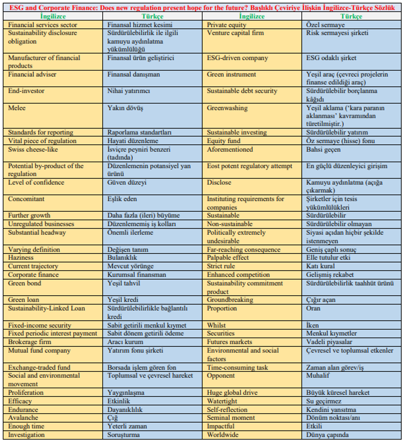 Sürdürülebilirlik İle İlgili Kamuyu Aydınlatma Yönetmeliği, düzenlemeye tabi olmayan işletmelerin yatırım alacak olmaları halinde ‘sürdürülebilir’ olarak sınıflandırılmaları için de ölçütler belirlemektedir. Bununla birlikte, anılan yönetmelik, raporlama standartlarının standartlaştırılmasında önemli bir ilerleme sağlamakla beraber, ESG finansmanının mevcut hızıyla büyümeye devam etmesi için hâlâ uzun bir yol vardır. Ayrıca, ESG’nin değişen tanımları ve sınıflandırmaları konusunda endişeler bulunmaktadır. Bu bulanıklık, ‘ESG’ etiketini zayıflatır; Merryn Somerset Webb’in işaret ettiği gibi, ‘bir adamın gördüğü yeşil rüyalar çoğu zaman başkalarının günahı yüzündendir’ (one man’s green dream is very often another’s sin stock).